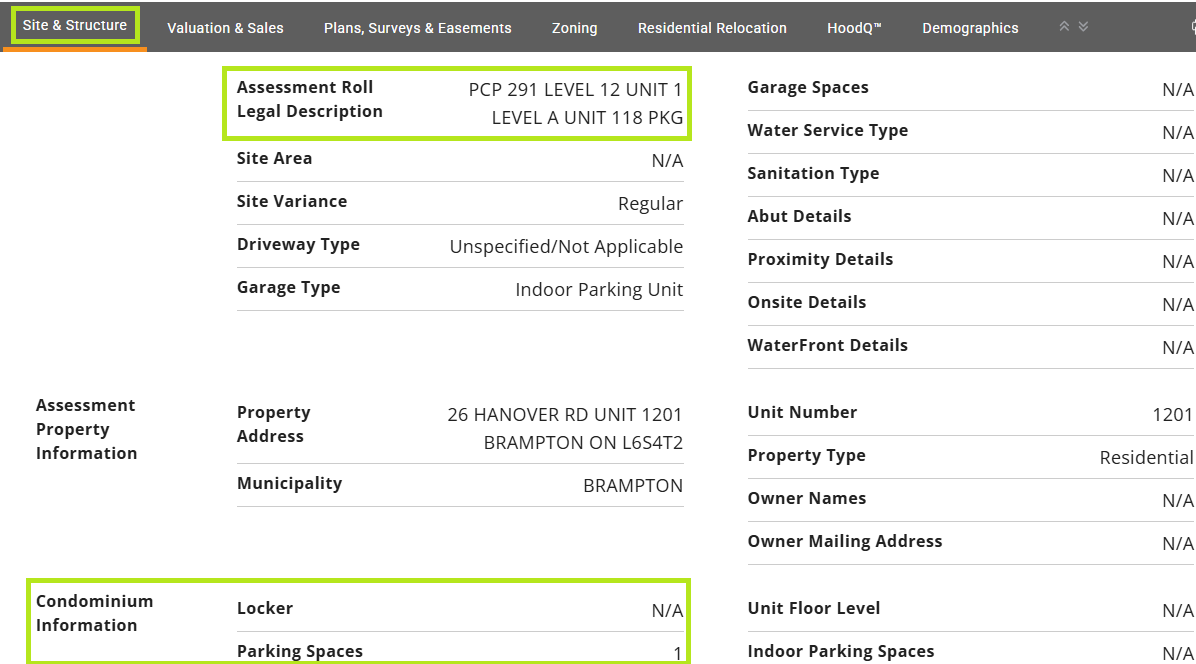 If there is a parking space or storage locker associated to a condo unit, it will be assigned a PIN and can be found under the Condo Details section of the property report.